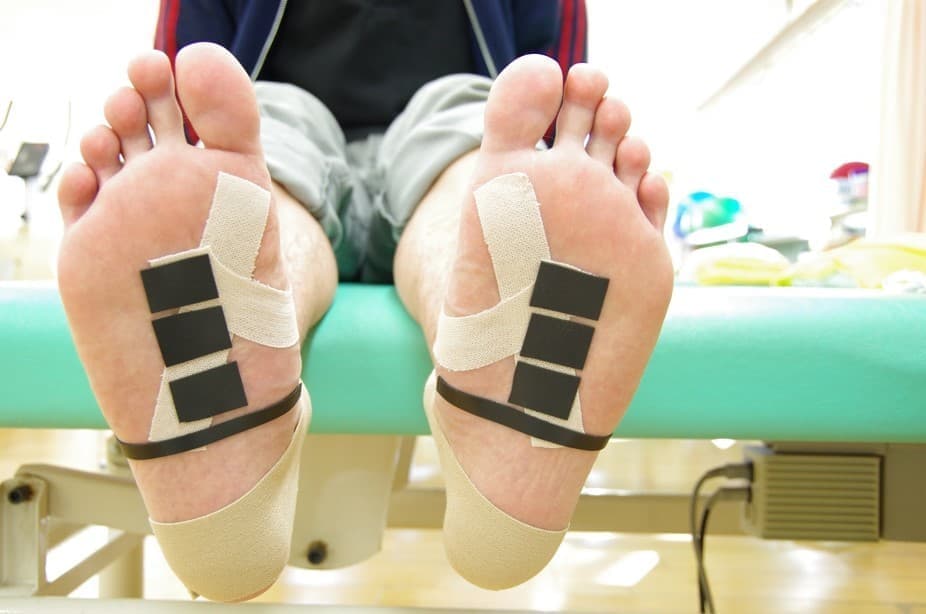 テーピングやゴム板のパッドを使用し、足部の形状を変化させ、痛みや目的とする動作が改善されていることを確認していきます。