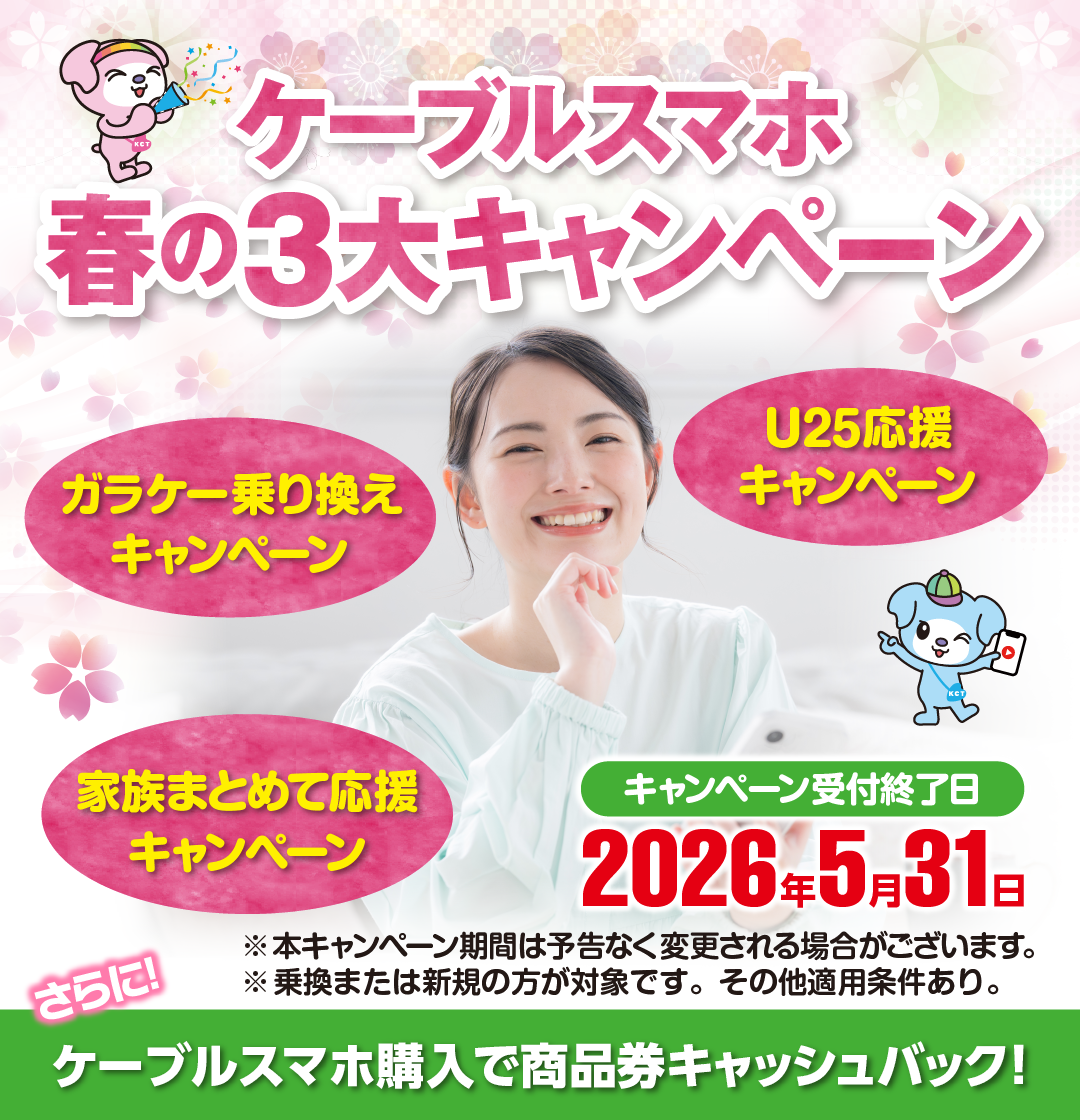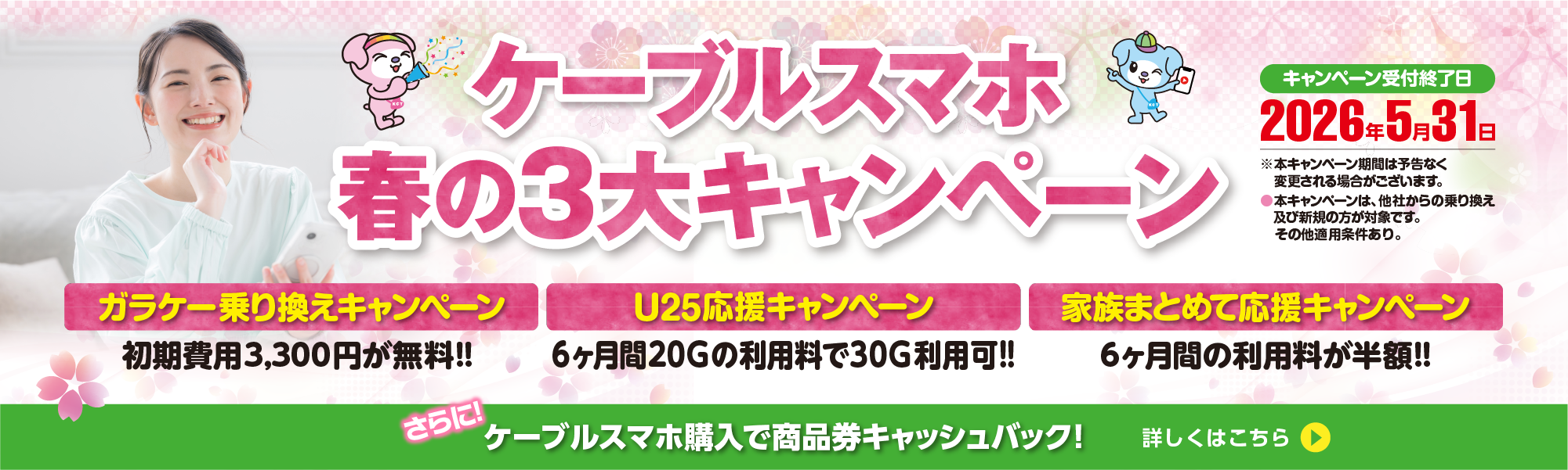 鹿沼ケーブルテレビでは、「春の3大キャンペーン」を実施しています。 ①ガラケー乗り換え(初期費用3,300円無…